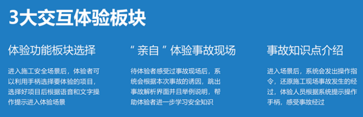 能够展现更多的体验场景,同时VR场景更加真实完整,系统根据真实场景虚拟再现,让体验者直接在虚拟的项目中进行安全体验。